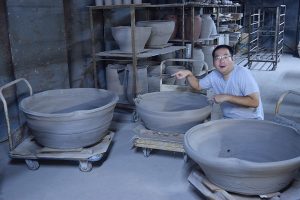 こんな大きさの水鉢もこの土練機から出した”紐”を元にして作っています。そして片手に乗る食器類もこの土練機からの土で作れます。